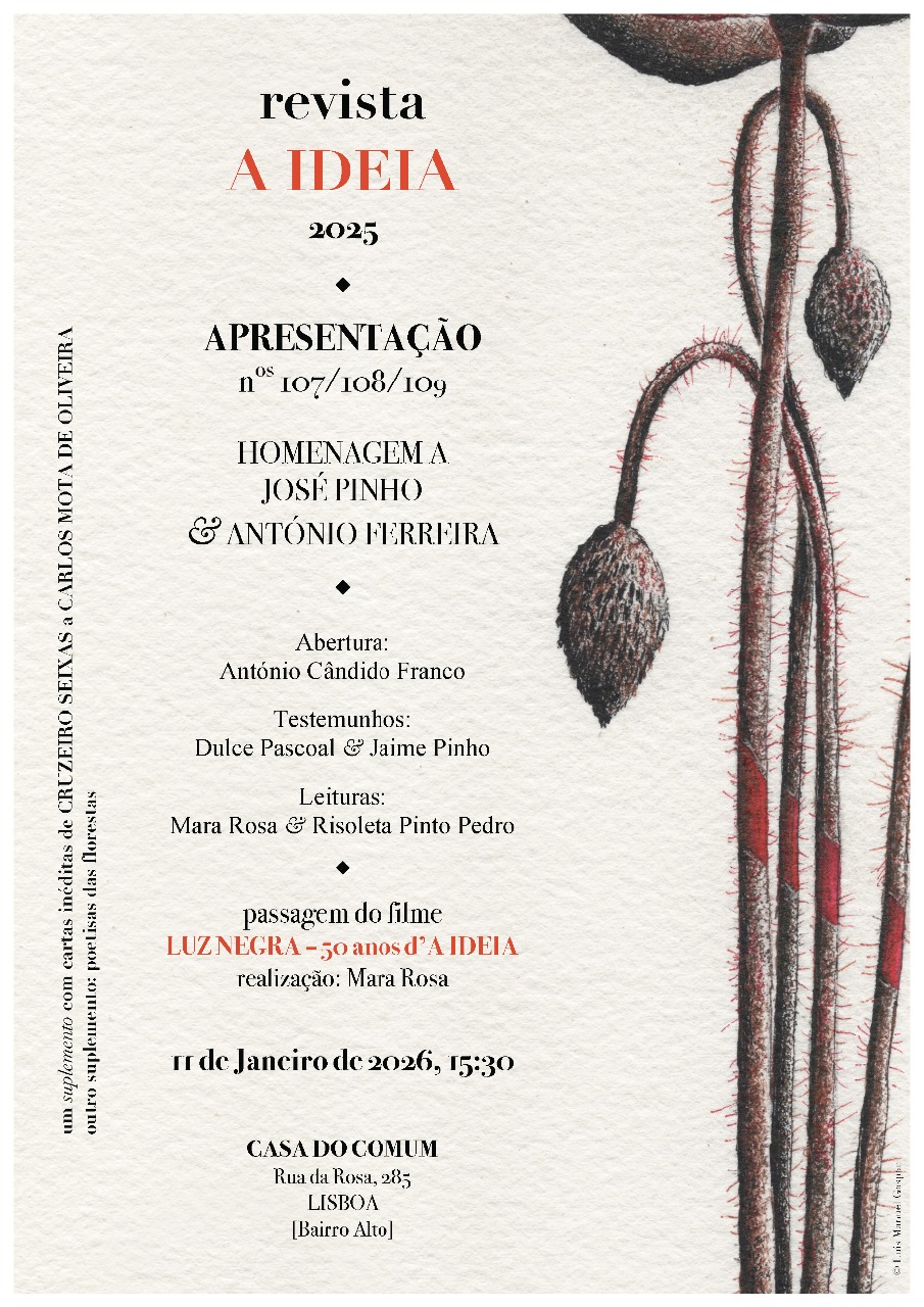 No passado dia 11 de Janeiro, na Casa do Comum, no Bairro Alto, em Lisboa, foi lançado o número triplo (107/109) de 2025 da revista A IDEIA, a cuja apresentação se seguiu, na segunda parte da sessão, a projecção do documentário cinematográfico de Mara Rosa, LUZ NEGRA – CINQUENTENÁRIO DA REVISTA A IDEIA. Na assistência, contavam-se entre 60 a 70 pessoas.